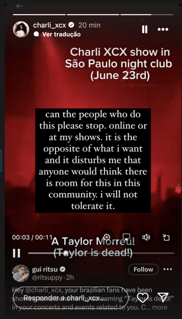 Charli XCX, que se apresentou em uma boate em São Paulo, na madrugada deste domingo (23), criticou a postura dos fãs brasileiros que fizeram um coro de “A Taylor [Swift] morreu” no show.
