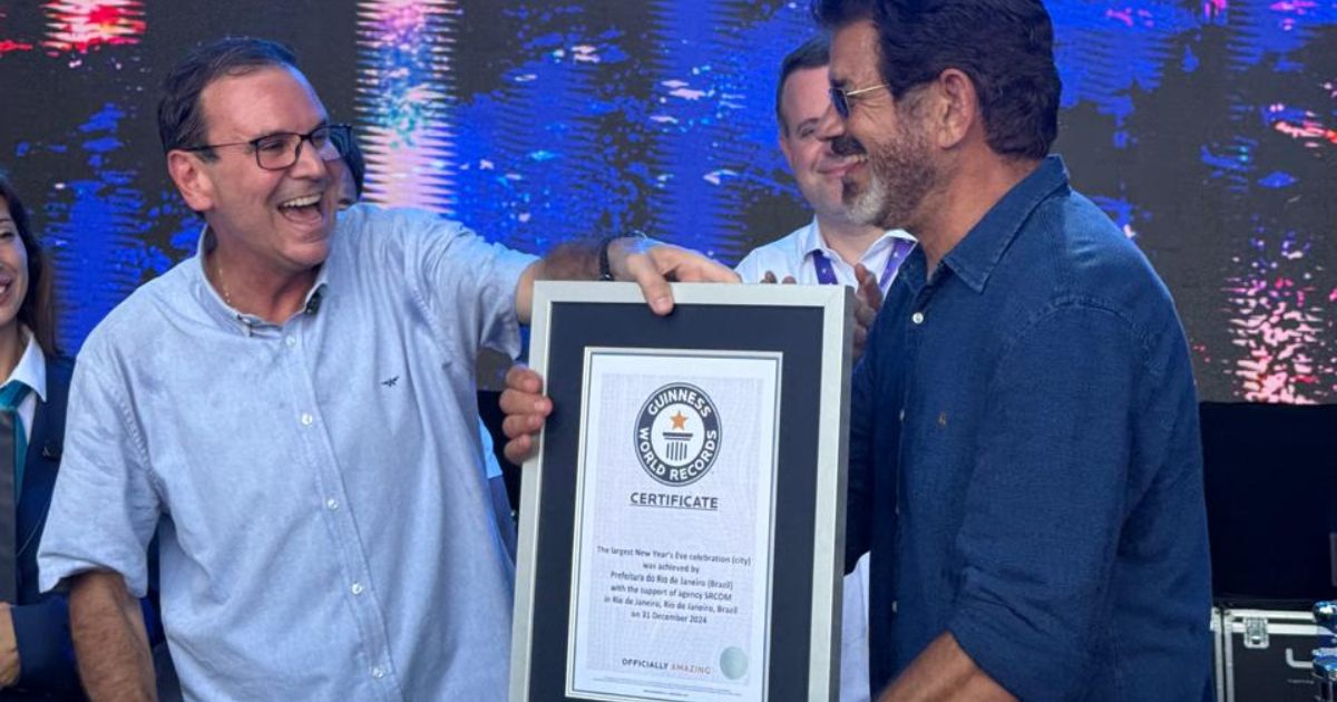 O certificado foi dado ao prefeito Eduardo Paes (PSD) no palco em Copacabana. Segundo a instituição, a cidade comprovou a presença de 2,5 milhões de pessoas em 2025 na faixa de areia em frente ao palco na praia.
